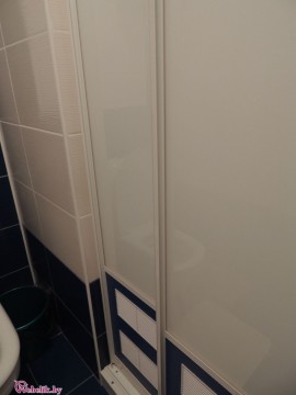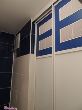 В нем, согласно желанию заказчика, мы установили раздвижные двери, за которыми удобно расположился вместительный отсек с хозяйственными принадлежностями.